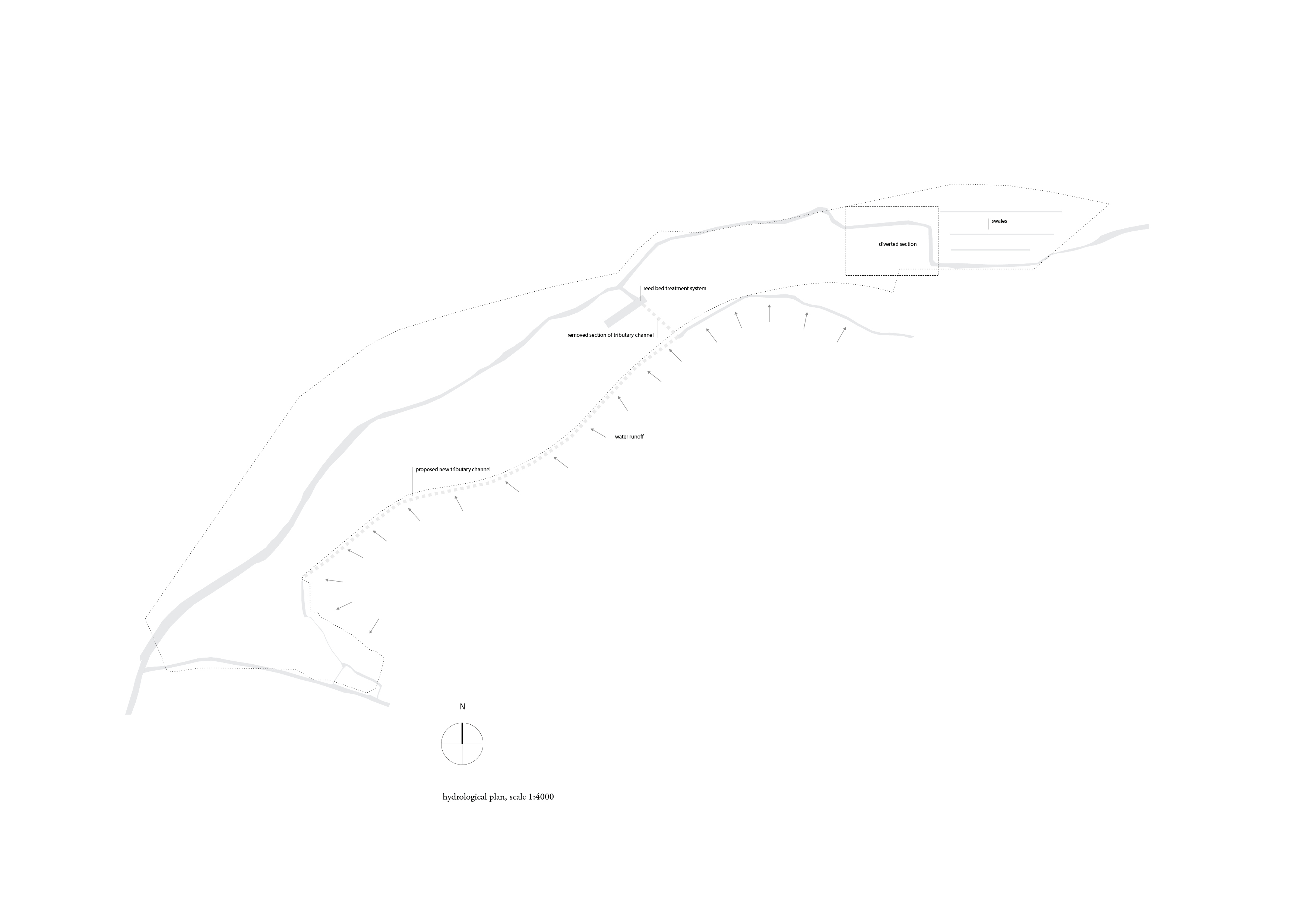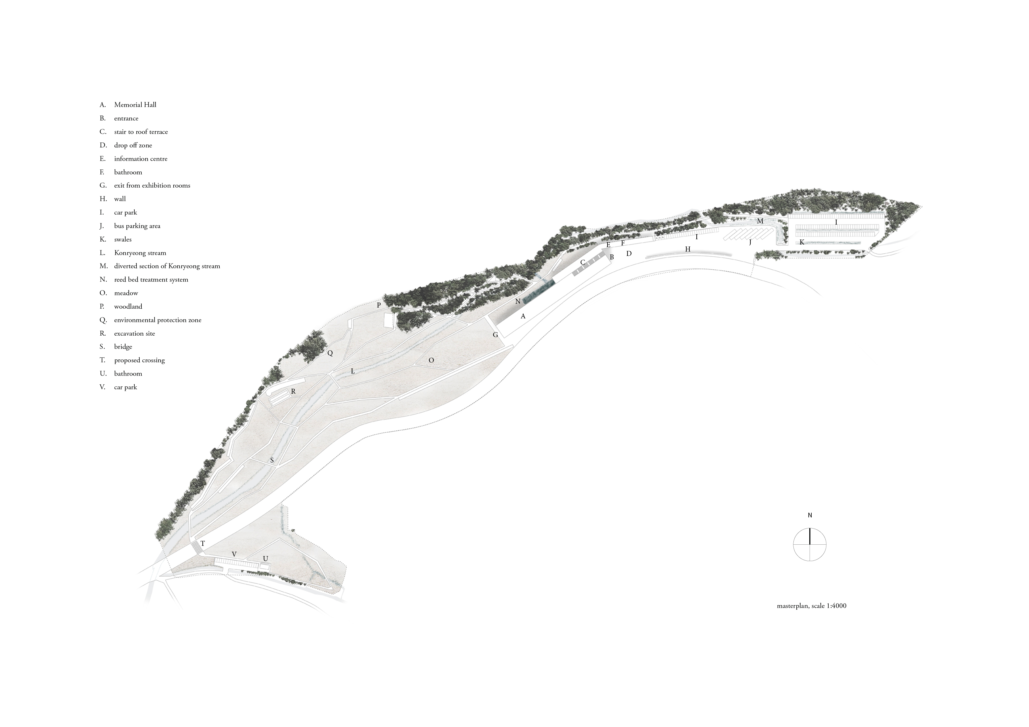 A section of the Konryeong stream, located by the bus parking area, will be diverted in order to ensure a better traffic flow on site. Swales will be constructed in the car park for water retention purposes in order to retain the water in the area. The swales functions as a sustainable vegetational filter to retain and cleanse the water runoff in the carpark area. Grey water collected from the Memorial Hall building will be cleaned by using sustainable phytoremediation technique through the construction of a reed bed treatment system, located by the section of the previous tributary water channel that has been closed off. The remaining section of the channel will be re-used as an outlet channel for clean water discharged from the reed bed system into the Konryeong stream.