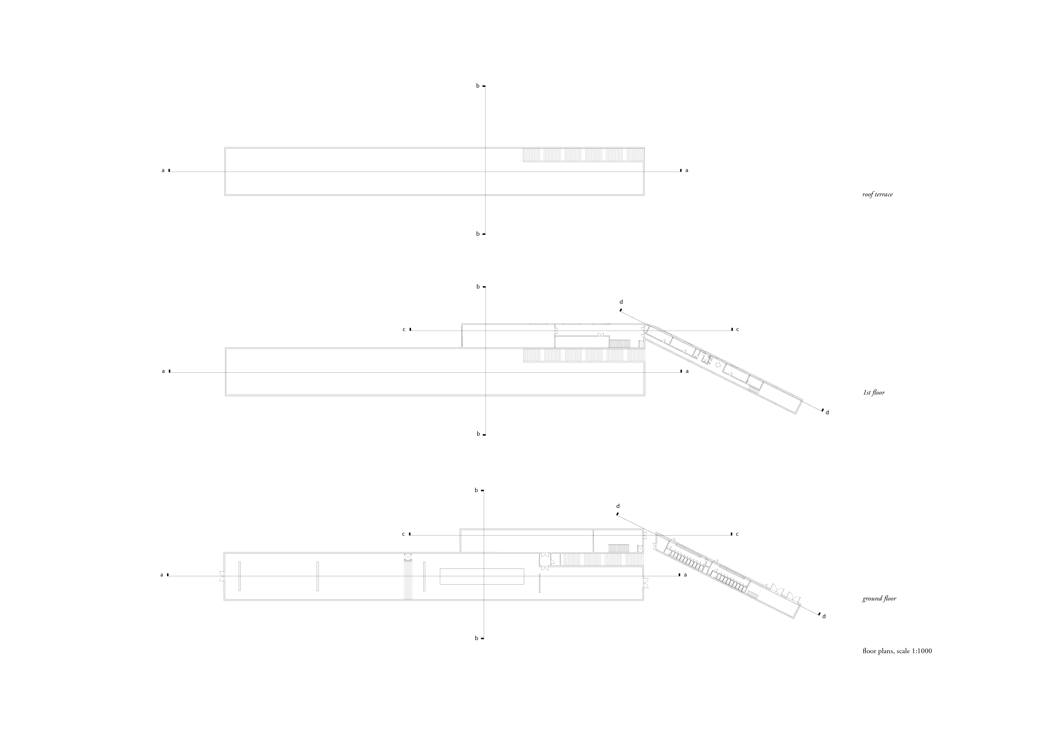 The spatial concept for the park is based on creating a respectful and dignified place that is honouring the memory of the civilians that lost their lives in the Korean war. The site is divided into two main parts – the building with the adjacent carpark, located to the East of the building, and the park landscape in the West part of the site. By positioning of the Memorial Hall in the Eastern part of the site it distances the activity around the building, and the vehicular movement around it, from the park area, in order to allow quietness and stillness around the excavation sites. As visitors will arrive to the Memorial Hall building from two directions, the building is designed with front facades on three sides, including the facade to the South that runs parallell to the road. The entrance is located to the East, and the exit from the exhibion spaces is on the opposite side of the building, visually functioning as a front facade to the meadow area and visitors arriving from the East. The South facade is visually extended by a curved wall, which functions as a structural division to the road and encloses the courtyard in front of the building, marking the entrance to the Memorial Hall and the park. The building consists of three intersecting volumes with separate programmatic uses, that are combined to form a single structure. For programmatic purposes, the design of the building is not using windows in the exhibition section of the building, and the concept is therefore based on designing a structural volume with mainly closed facades. This results in a building structure with an