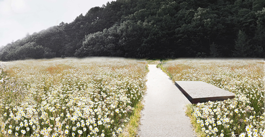 architectural form of enclosure. The linearity of the building, which is reflected in the elongated shape of the valley that defines the site, derives from the linear sequence of spaces for commemoration and exhibitions, where the entrance is located to the East, and the exit from the exhibition rooms is to the West. The linearity of the building allows a sequential configuration of spaces for the exhibitions. It is central to the spatial concept of the commemoration and exhibition spaces for the visitor to go through the rooms sequentially and to leave the exhibition rooms by entering into the openness and light of the meadow. The ending of the sequence of rooms is therefore a significant and vital aspect of the experience of the exhibition section of the building, as it is important for the visitor to leave the distressful and emotionally heavy topic displayed in the exhibition rooms with a sense of relief and closure. In the summer, the meadow will be filled with white daisies. The flowers will be filling the valley in a seasonal display of blooms that will transform the valley into a white field. The meaning of flowers holds a special significance in Korean culture and this has been taken into account in the design of the park and in the choice of vegetation. The planting plan is using mainly native Korean species with white flowers. In Korean culture, the colour of white symbolises life, purity and innocence, and white daisies are given at funerals to mark the solemnity of the occasion. Therefore, the concept for the design of the park is centered around the design of a field of thousands of daisies, planted in rememberance of the civilian victims of the conflict.